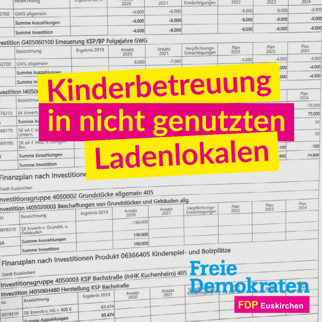 Im Rahmen der Haushaltsplanberatungen hat die FDP-Fraktion initiiert, dass in Zusammenarbeit mit den Hauseigentümern geprüft wird, ob leerstehende Ladenlokale für kleingliedrige Kindertagesbetreuung durch Tagesmütter oder kleingliedrige Kindertagesbetreuung im Auftrag von Elterninitiativen zur Verfügung gestellt werden können. Eine Bezuschussung für evtl. notwendige Umbaumaßnahmen sollte in diesem Zusammenhang ebenfalls geprüft werden.
