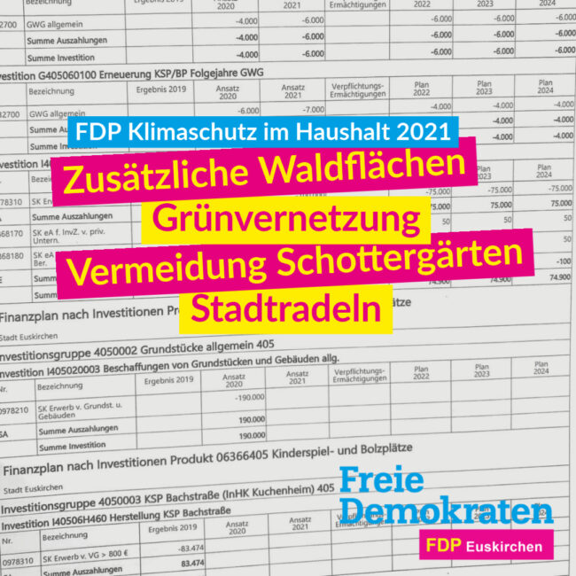 Im Anfang Mai verabschiedeten Haushaltsplan 2021 wurden auf Initiative der FDP-Stadtratsfraktion zum wichtigen Thema „Klimaschutz“ u. a. folgende Vorschläge berücksichtigt: Zusätzliche WaldflächenUnsere langjährige Anregung, zusätzliche Waldflächen in Euskirchen anzulegen, wird endlich angegangen. Für dieses Jahr ist vorgesehen, ca. in Größe eines Fußballfeldes am Billiger Wald nahe der Siedlung Euskirchener Heide die Waldflächen zu erweitern. Für…