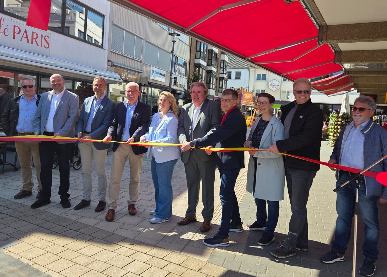 Fast vier Jahren nach der Flutkatastrophe war es endlich soweit. Die Fußgängerzone in der Innenstadt wurde endlich nach Beendigung der Pflasterarbeiten wiedereröffnet. Nicht nur die Besucher, sondern auch die Geschäftsleute, die jahrelang durch die Folgen der Flut und den Widrigkeiten durch Bauarbeiten und unzulänglicher Erreichbarkeit gelitten hatten, freuten sich bei herrlichen Wetterverhältnissen. Die stellvertretende Bürgermeisterin Sandra Eisermann hielt die offizielle Eröffnungsansprache und meinte, die Stadt hätte aus der Notlage das Beste gemacht und sie genutzt, um die Innenstadt aufzuwerten und zu einem Ort zum Verweilen zu machen. Anschließend bat sie die Vertreter der im Stadtrat vertretenen Fraktionen zum symbolischen Scherenschnitt zur Eröffnung. Das Bild zeigt – im Gegensatz zur Lokalpresse – alle Beteiligten von Rat und Verwaltung; wir grenzen hier niemanden aus. Auch verteilte Vizebürgermeisterin Eisermann Stücke vom riesigen Stadt-Kuchen.