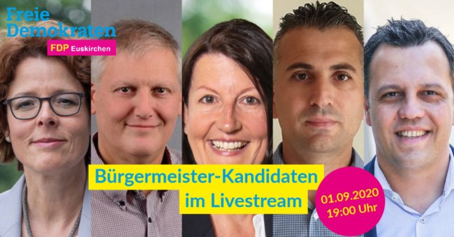 Die FDP Euskirchen hat auf die Aufstellung einer eigenen Kandidatin bzw. eines Kandidaten verzichtet. Wir als Freie Liberale vertrauen auf das Urteilsvermögen und die Vernunft der Wählerschaft. Damit sich jeder einen konkreteren Eindruck über die Kandidatinnen und Kandidaten verschaffen kann, haben wir alle fünf zu einer Gesprächsrunde eingeladen. Diese wird am 1.9.2020 ab 19:00 Uhr…