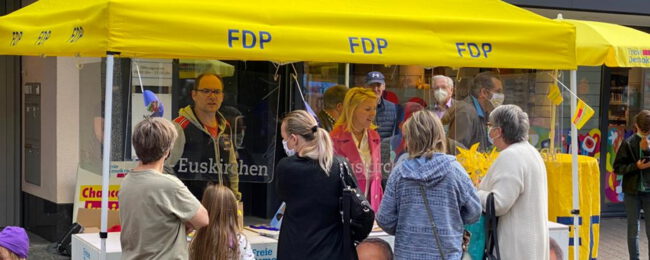 Die FDBedingt durch die Corona-Pandemie haben wir die Zahl der Info-Stände in der Euskirchener Fußgängerzone auf die drei Samstage vor den Kommunalwahlen am 13. September reduziert. Aber dies ist nicht unser einziger Standort. Thomas Scholzen hat schon mehrfach einen Sonderstand auf dem Rüdesheimer Platz abgehalten. Es geht also mit Elan, Infomaterial und kleinen Werbegeschenken sowie…